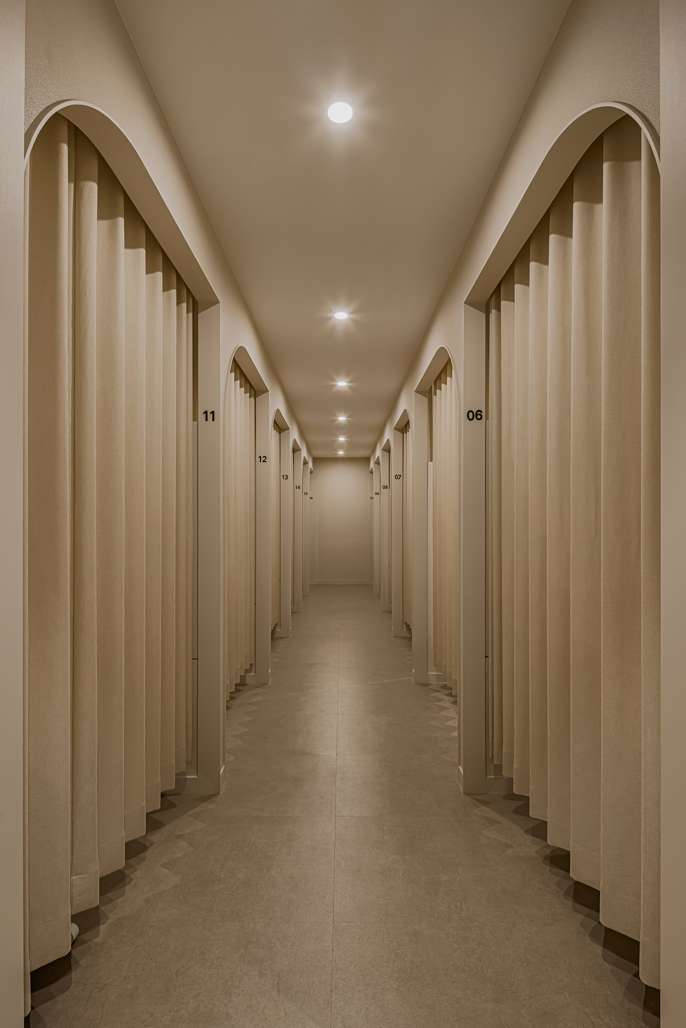 진료실로 향하는 복도는 환자들의 긴장감이 가장 고조되는 구간입니다. 요토공간은 이 긴장을 ‘곡선’으로 풀었습니다. 딱딱하고 날 선 직선 게이트 대신, 부드러운 아치(Arch) 형태의 입구를 디자인하여 공간의 흐름을 유연하게 만들었습니다. 또한, 관리실 입구에는 육중한 도어 대신 차분한 컬러의 패브릭 커튼을 적용했습니다. 이는 답답한 폐쇄감을 줄이면서도 프라이버시는 확실히 지켜주는 장치로, 기능성과 심미성을 동시에 잡은 디테일입니다.