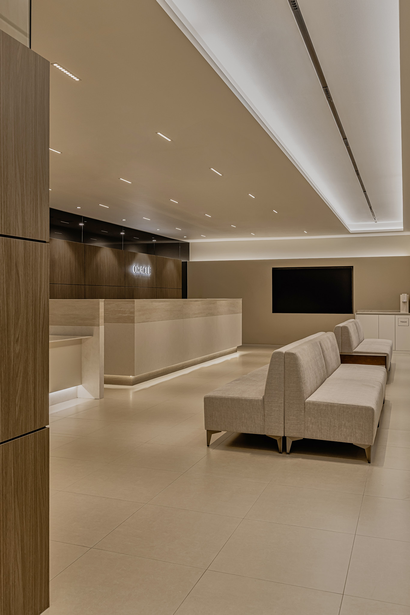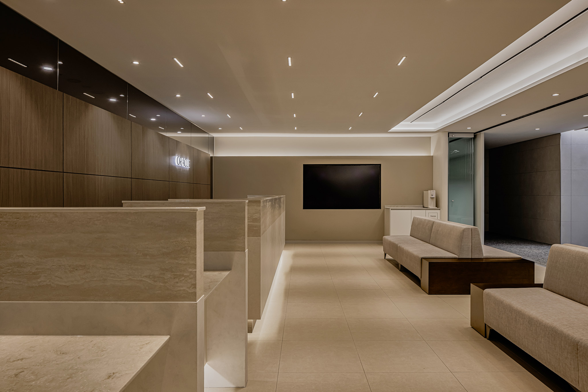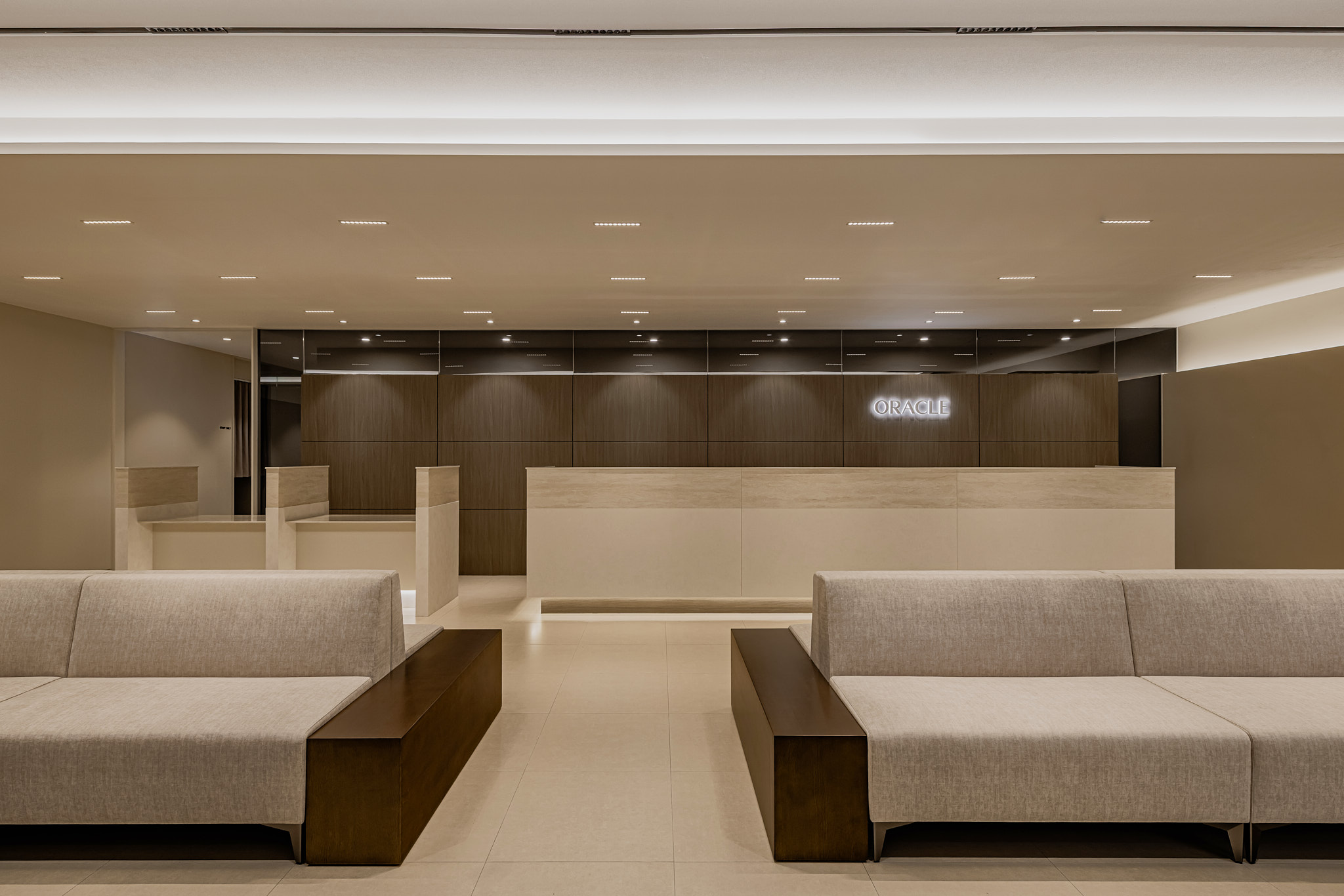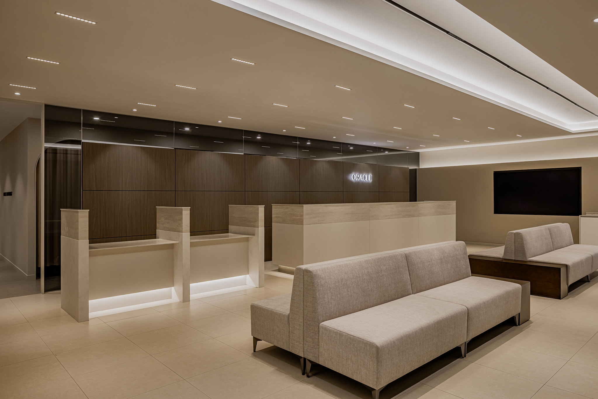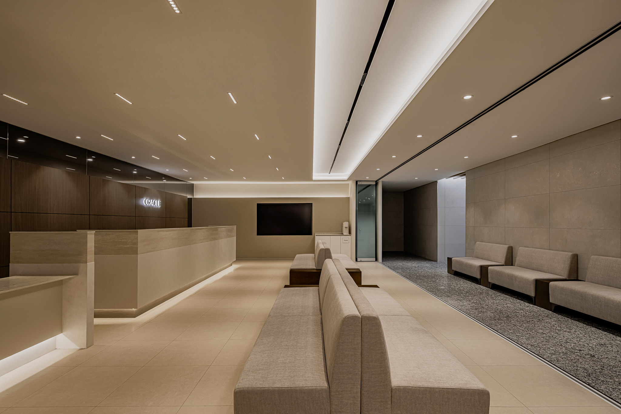 병원의 로비는 환자가 처음 마주하는 얼굴이자, 대기 시간이 발생하는 공간입니다. 따라서 ‘눈부심 없는 조도 설계’에 집중했습니다. 직접적으로 쏘는 다운라이트(매입등)는 최소화하고, 천장 라인을 따라 흐르는 간접 조명(Cove Lighting)과 라인 조명을 메인으로 배치했습니다. 벽과 천장을 타고 은은하게 퍼지는 빛은 마치 고급 호텔 라운지에 머무는 듯한 안락함을 선사합니다. 여기에 차가운 가죽 소파 대신, 텍스처가 살아있는 패브릭 소재의 가구를 매치하여 시각적인 따스함은 물론 촉각적인 만족감까지 고려했습니다.