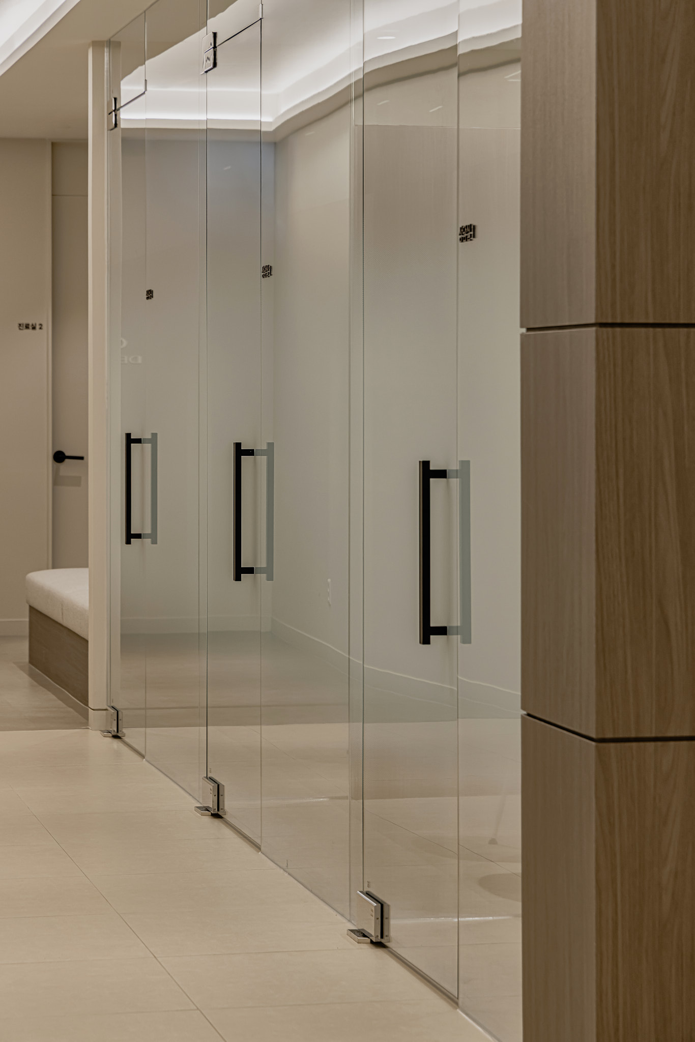 전체적인 베이스 컬러로 눈의 피로를 덜어주는 소프트 크림(Soft Cream) 톤을 선택했습니다. 자칫 붕 떠 보일 수 있는 밝은 공간에 중심을 잡아주기 위해, 시선이 가장 먼저 닿는 인포데스크와 주요 벽체에는 딥 월넛(Deep Walnut) 필름을 과감하게 사용했습니다. 이러한 톤온톤(Tone-on-tone) 대비는 시각적으로 안정감을 줄 뿐만 아니라, 방문객의 무의식 속에 “이곳은 가볍지 않은, 깊이 있는 진료를 하는 곳”이라는 메시지를 전달합니다. 세련되면서도 중후한 멋, 이것이 바로 하이엔드 인테리어의 기본입니다.