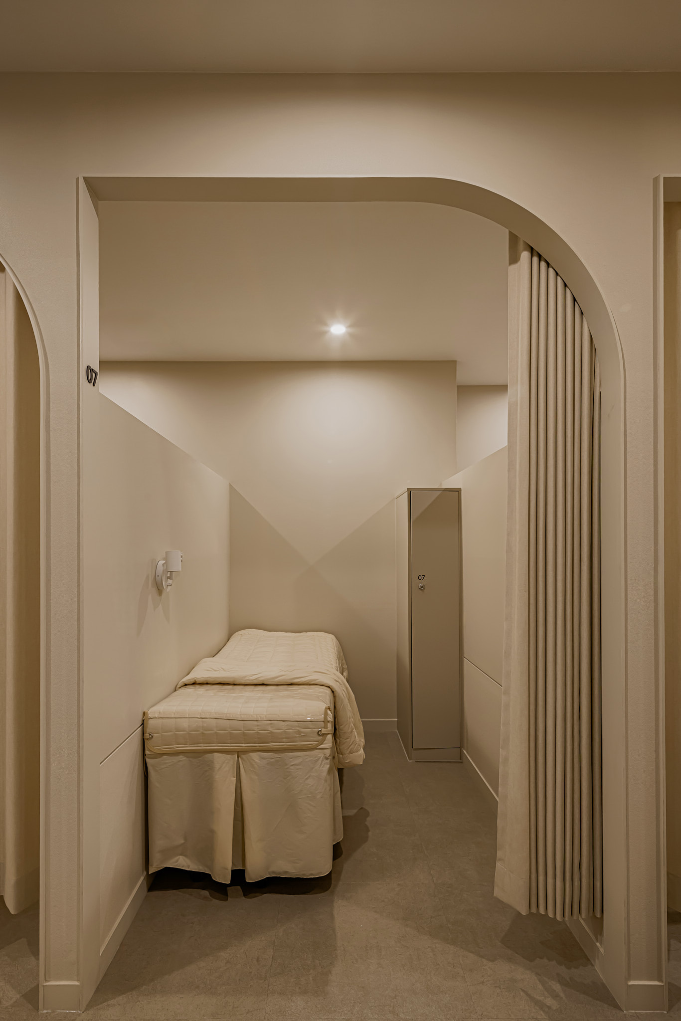 진료실로 향하는 복도는 환자들의 긴장감이 가장 고조되는 구간입니다. 요토공간은 이 긴장을 ‘곡선’으로 풀었습니다. 딱딱하고 날 선 직선 게이트 대신, 부드러운 아치(Arch) 형태의 입구를 디자인하여 공간의 흐름을 유연하게 만들었습니다. 또한, 관리실 입구에는 육중한 도어 대신 차분한 컬러의 패브릭 커튼을 적용했습니다. 이는 답답한 폐쇄감을 줄이면서도 프라이버시는 확실히 지켜주는 장치로, 기능성과 심미성을 동시에 잡은 디테일입니다.