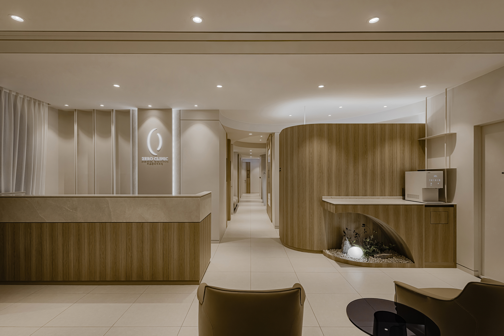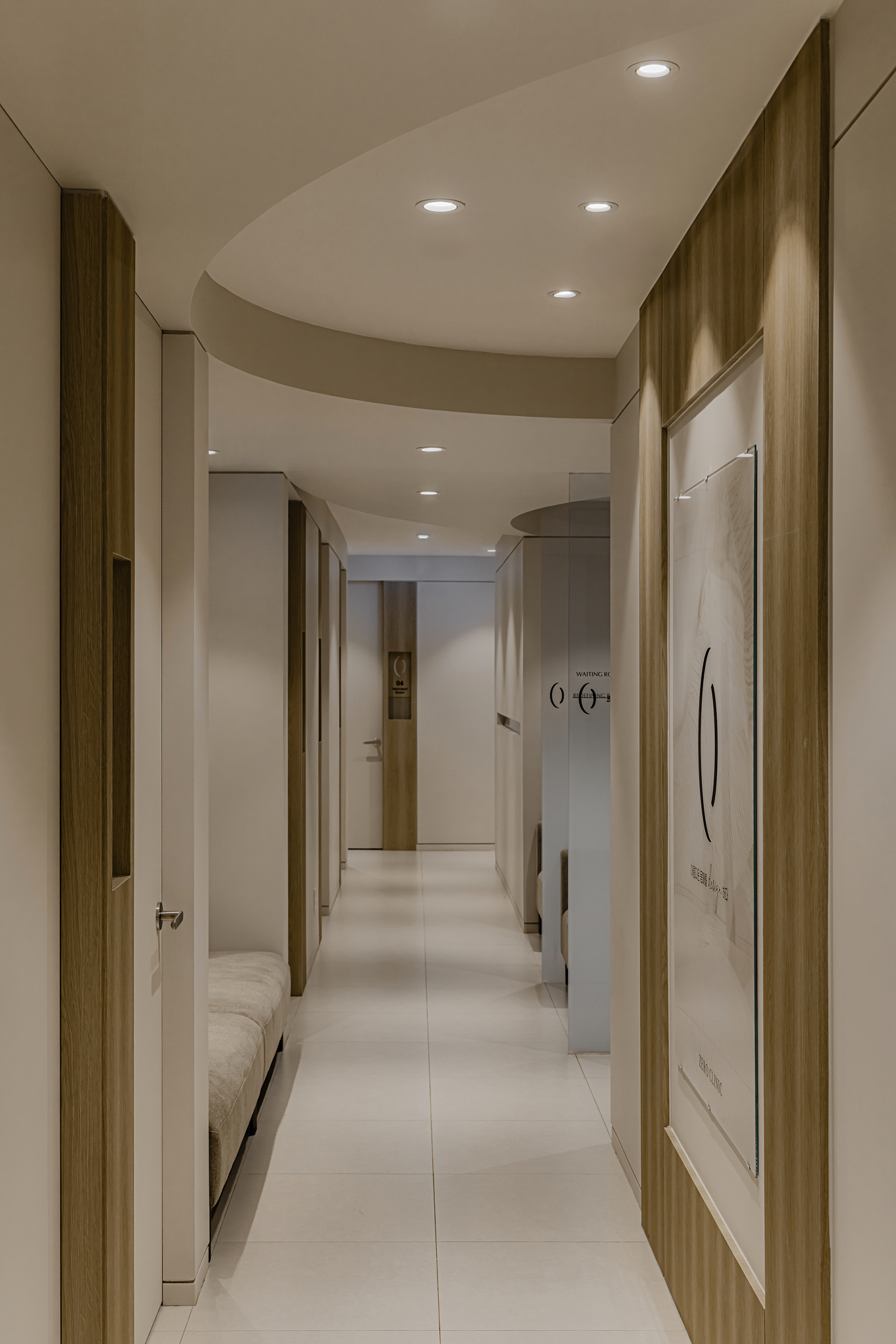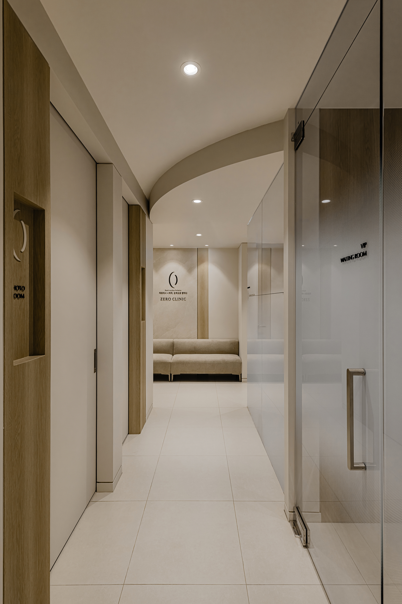 Point 01. Color & Tone: 신뢰의 무게감 너무 가볍지 않은 차분함, 이것이 하이엔드 병원의 핵심입니다. 전체적인 베이스는 따뜻한 샌드 베이지 톤을 사용하되, 마감재의 텍스처를 달리하여 공간의 깊이감을 더했습니다. 특히 로비 천장과 벽이 만나는 지점을 둥글게 처리한 곡선 마감은 시공 난이도가 높지만, 공간을 훨씬 넓고 웅장해 보이게 만드는 핵심 디테일입니다.