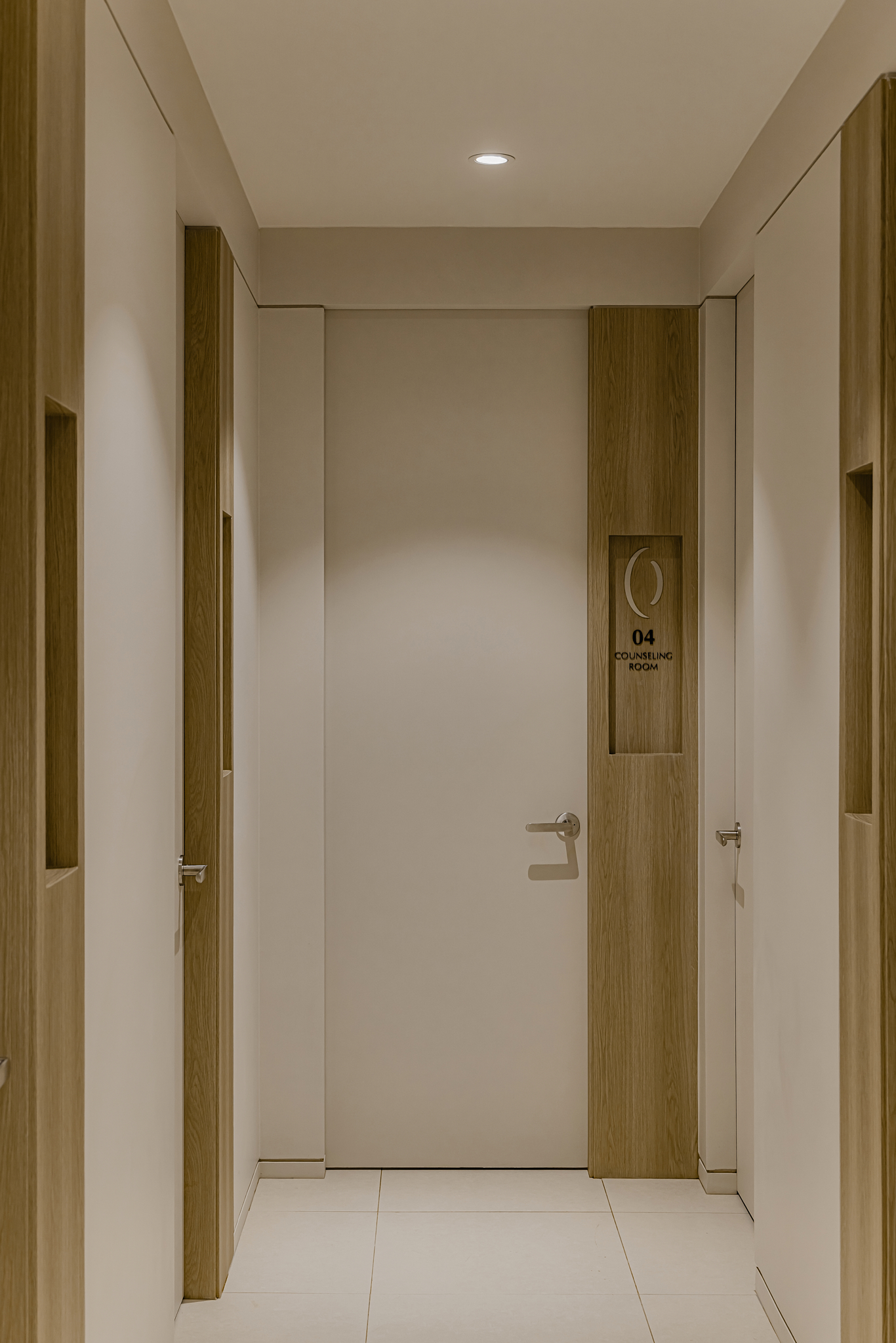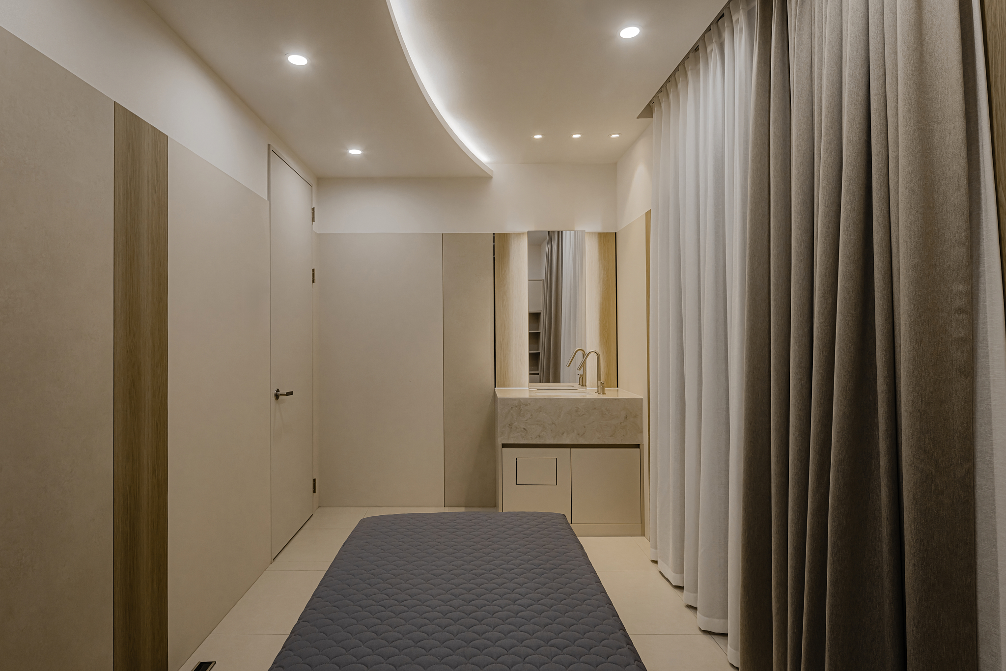 ​Point 04. Function: 미니멀리즘과 휴식 VIP 관리실은 ‘휴식’이라는 본질에 집중했습니다. 복잡한 장식은 덜어내고(Minimalism), 매립형 가구로 공간 효율을 높였습니다. 조명 또한 환자의 눈부심을 방지하는 조도 설계가 적용되었으며, 커튼 하나까지도 톤을 맞춰 아늑한 분위기를 완성했습니다.