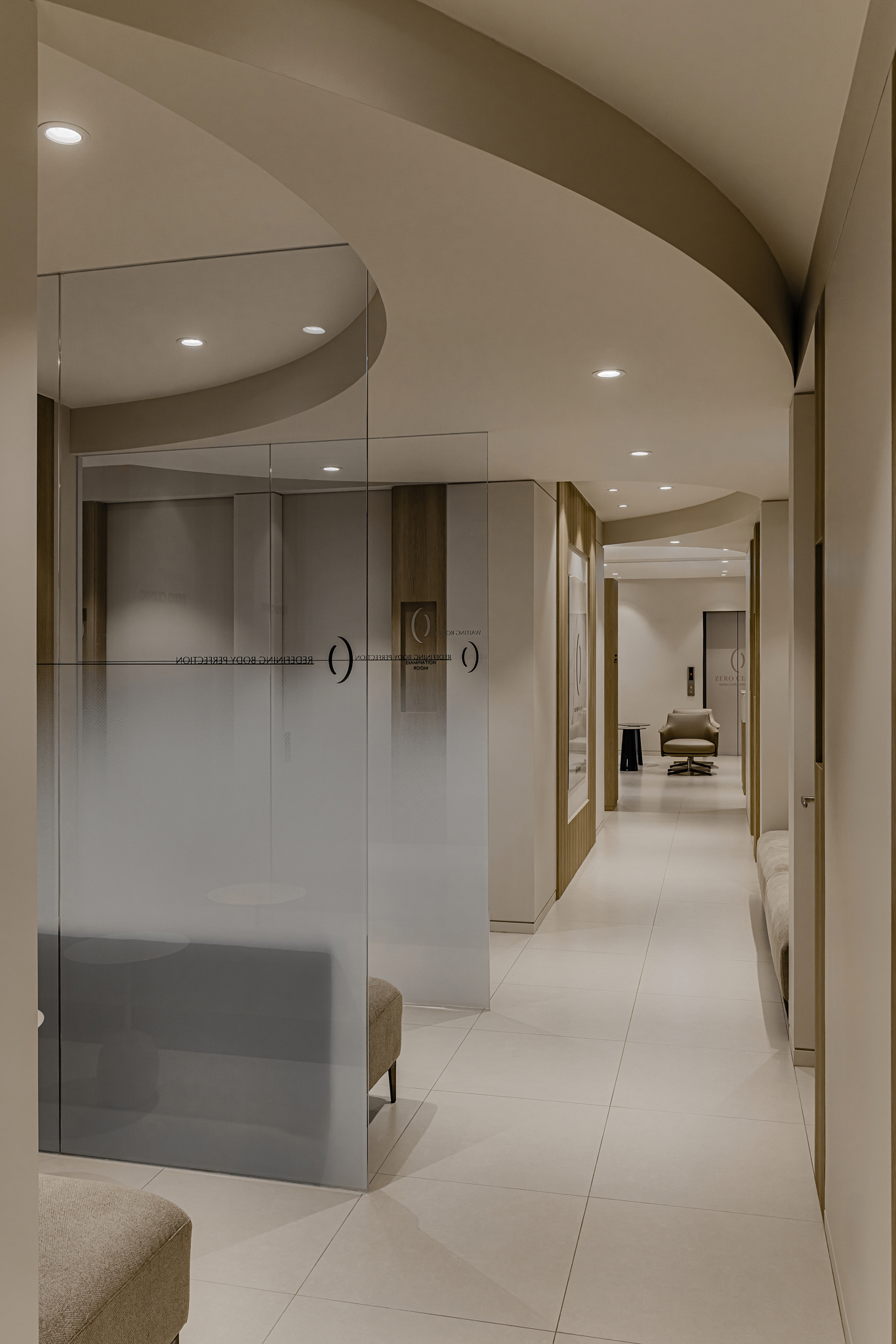 ​Point 02. Layout: 유연함이 주는 심리적 안정 복도는 환자의 불안감이 고조될 수 있는 전이 공간입니다. 저희는 이를 해소하기 위해 ‘라운드 월(Round Wall)’ 설계를 도입했습니다. 시각적으로 부드럽게 이어지는 벽면 라인은 환자의 동선을 자연스럽게 유도합니다. 상담실의 유리 파티션에는 그라데이션 필름을 시공하여, 답답한 폐쇄감 없이도 프라이버시를 지킬 수 있도록 기능성을 강화했습니다.