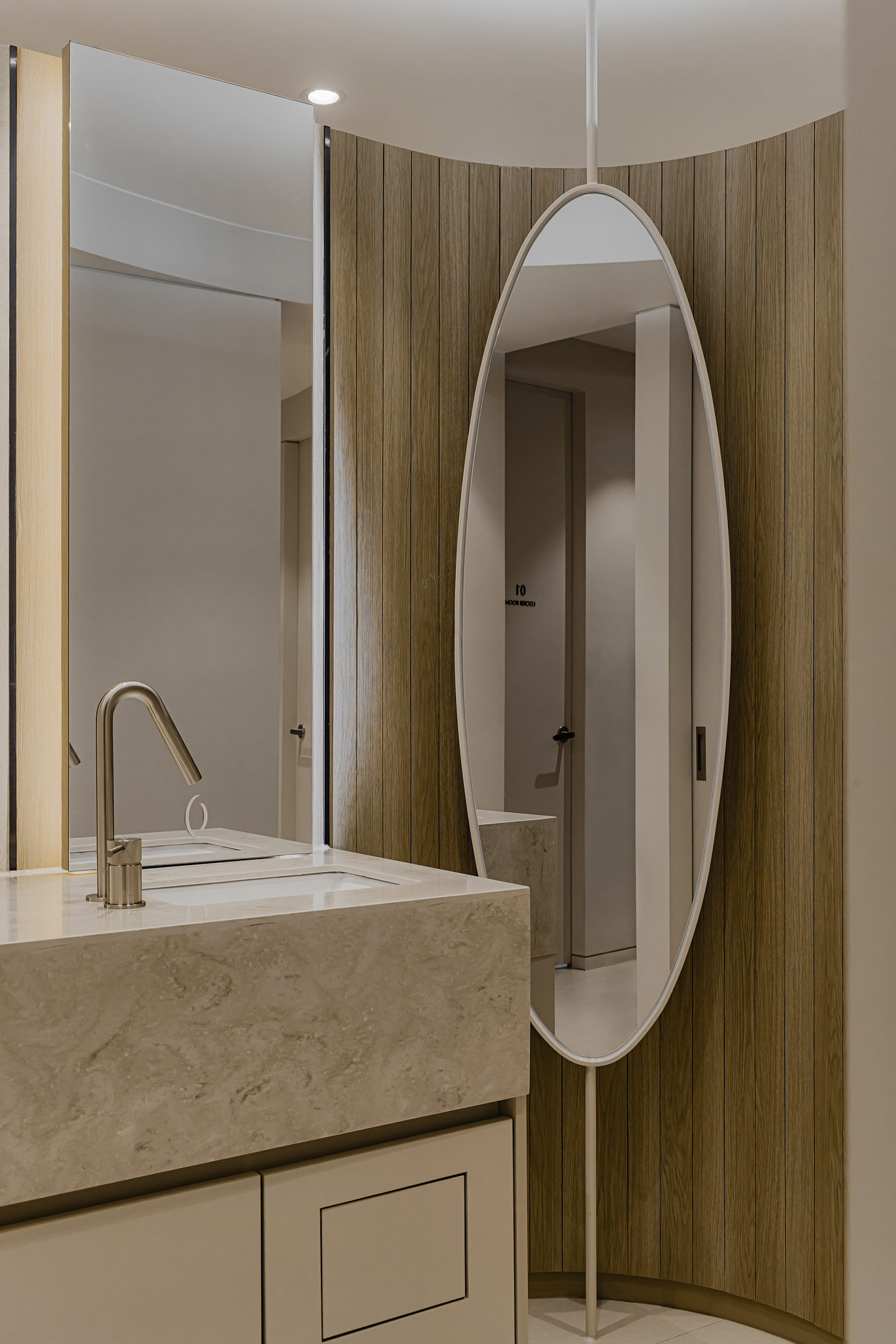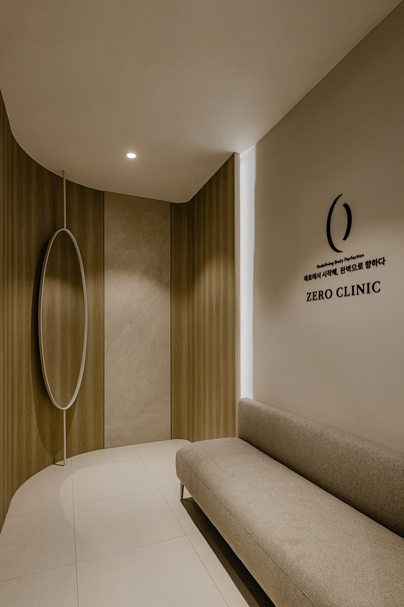 ​Point 03. Detail: 갤러리 같은 조형미 단순히 마감재만 좋다고 해서 고급스러운 공간이 되지는 않습니다. 공간의 포인트가 되는 타원형 거울과 적재적소에 배치된 간접 조명은 요토공간만의 디자인 감각을 보여줍니다. 이러한 장치들은 병원을 차가운 치료 공간이 아닌, 머물고 싶은 문화 공간처럼 느끼게 합니다.